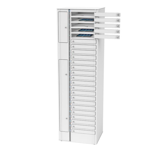 Der zioxi Volt iPad-Spind als Schrankturm mit 24 Ladefächern ist für Ihren Schulalltag einfach ideal: Verstauen und laden Sie Ihre Mobilgeräte mit Bildschirmgrößen bis 14 Zoll, wie passende iPads, Tablets oder kleine Laptops. Dank seiner kompakten Grundfläche von nur 53 x 46 cm findet der Spind dabei nahezu überall einen passenden Platz.