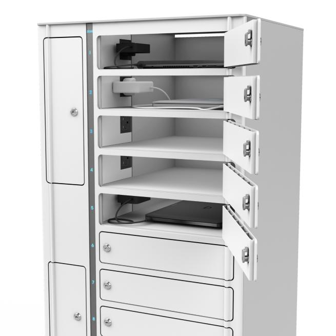 Das integrierte Stromversorgungssystem befindet sich in einem separaten Elektrofach. Dieses ist mit abschließbaren Frontklappen ausgestattet, sodass auch bei mehreren, nebeneinander installierten Spinds der Zugriff jederzeit und nur durch Befugte möglich ist.
