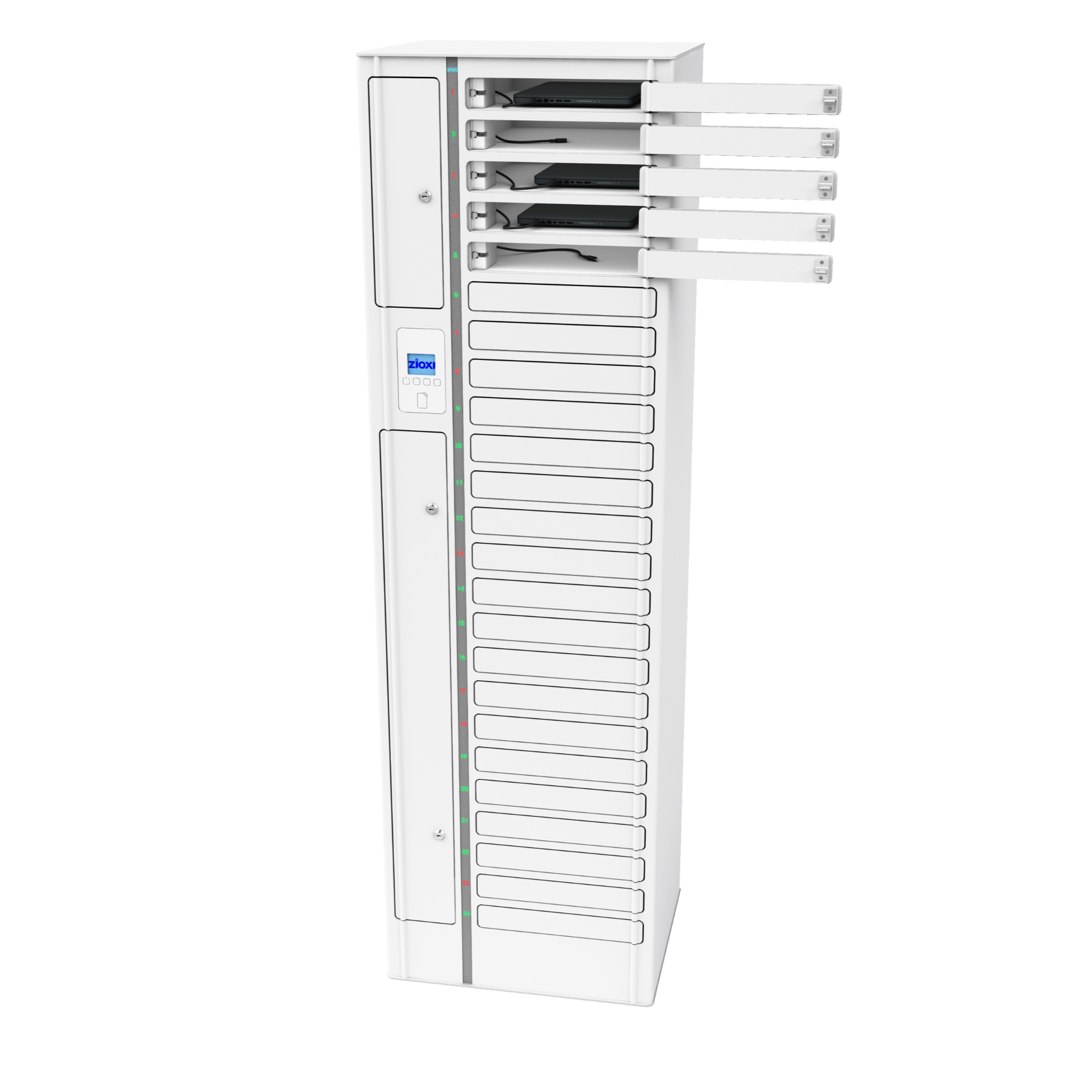 Der zioxi Volt onView Chromebook-Spind als kompakter Schrankturm mit 24 Ladefächern ist die ideale Unterstützung für Ihren Schulalltag: Verstauen und laden Sie Ihre Mobilgeräte mit Bildschirmgrößen bis 14 Zoll, wie passende Chromebooks, Tablets, Notebooks oder kleine Laptops.