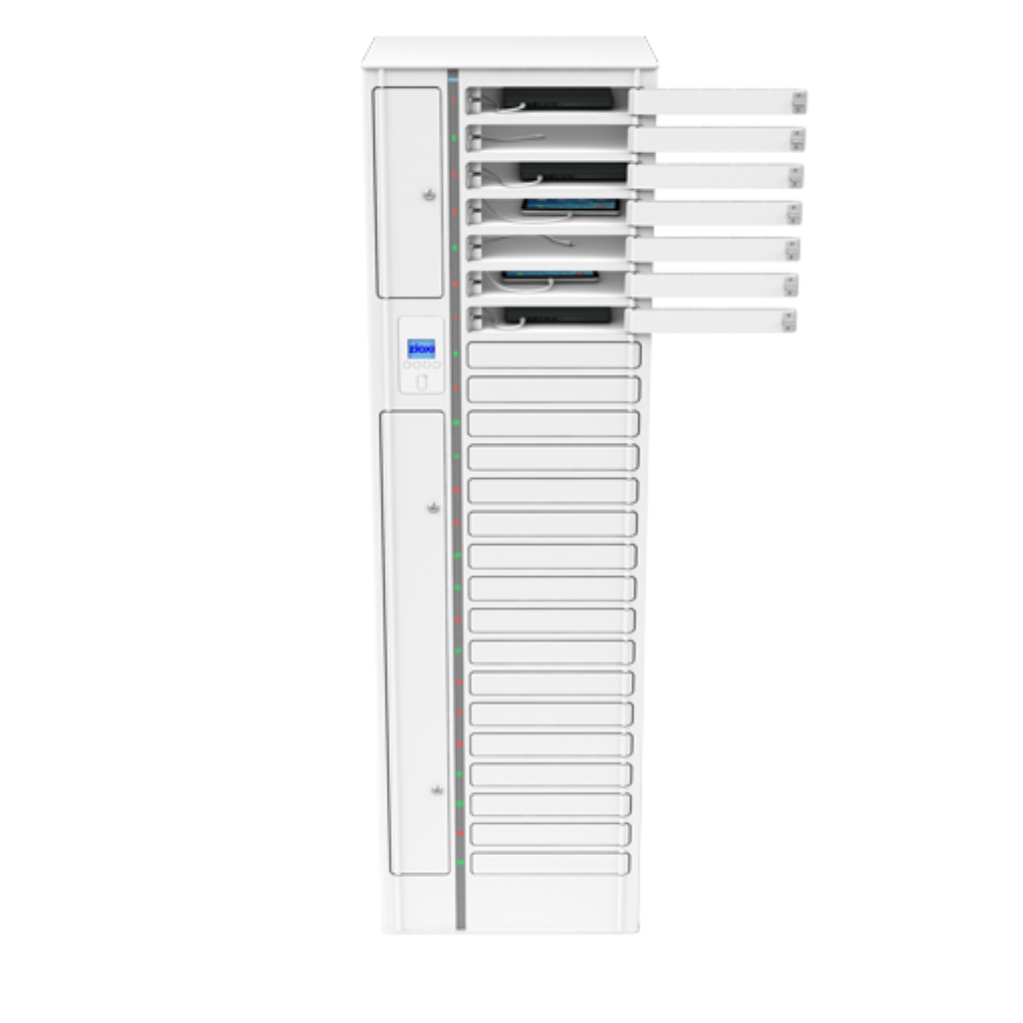 Der zioxi Volt onView iPad-Spind als Schrankturm mit 24 Ladefächern ist die ideale Unterstützung für Ihren Schulalltag: Verstauen und laden Sie Ihre Mobilgeräte mit Bildschirmgrößen bis 14 Zoll, wie passende iPads, Tablets oder kleine Laptops. Dank seiner kompakten Grundfläche von nur 53 x 46 cm findet der Spind dabei nahezu überall einen passenden Platz.