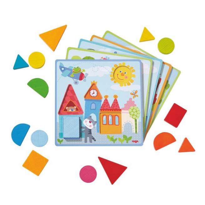 Die Sonne ist rund, das Feuerwehrauto rot und viereckig, aber wie heißt die Form vom Dach des Hauses? Mit dem Zuordnungsspiel Tierische Abenteuer lernen Kinder ab 18 Monaten spielerisch die Welt der Farben und Formen kennen. Auf 5 Legetafeln können sie die 15 bunten Legeplättchen den Gegenständen und Pflanzen zuordnen und sie in die Aussparungen puzzeln. Das macht Spaß und fördert die Feinmotorik.
