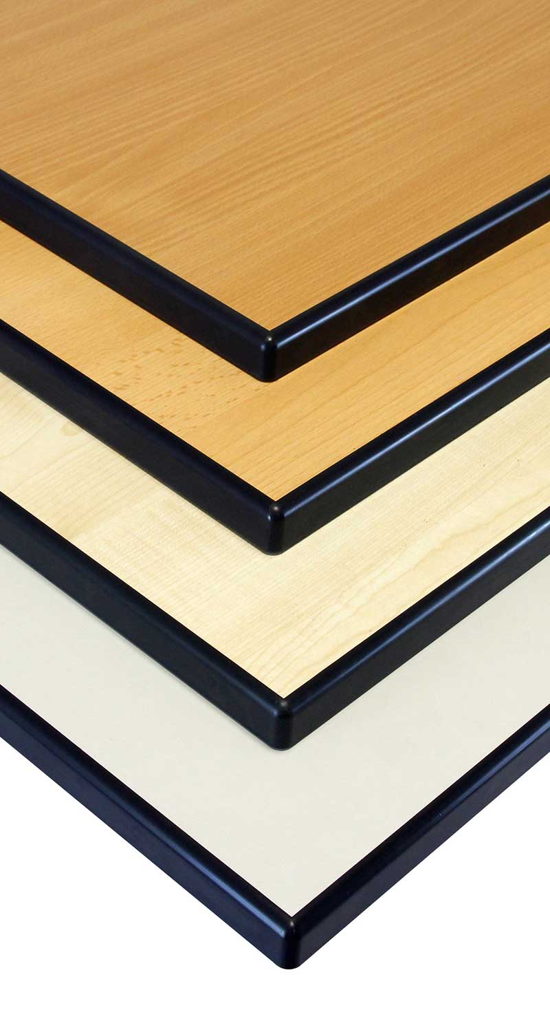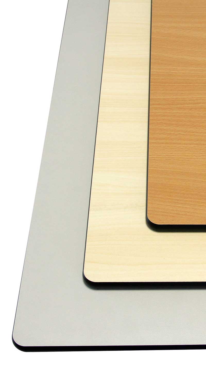 | Kante und Tischplatte sind dekorangepasst. Sie wird mit der Tischplatte seitlich unter Druck verklebt und schützt vor Schmutz und Feuchtigkeit. Die Tischplatten aus MDF (mitteldichte Faserplatte) sind 19 mm stark und melaminbeschichtet, d. h. kratzfest und leicht zu reinigen. Die Kanten halten leichte Stöße aus. | MDF (mitteldichte Faserplatte), 22 mm stark mit einer Kante aus PUR-Giesharz. Die Kante wird in einer großen Form gegossen und verbindet sich unter Wärme und Druck unlösbar mit der Tischplatte. Diese Kante ist enorm widerstandsfähig und hält auch starke Schläge und Stöße aus. Für Schülertische empfehlen wir Tische mit PU-Kante oder mit Vollkernplatte. | Die Vollkern- oder HPL-Platte (Hight Pressure Laminate) ist die haltbarste Tischplatte. Sie ist absolut unempfindlich gegen Schläge, Sonne und Wasser. Diese Platten sind nur unter Aufwendung allergrößter Gewalt und mit Hilfsmitteln zu beschädigen. Dabei sind sie absolut pflegeleicht. |