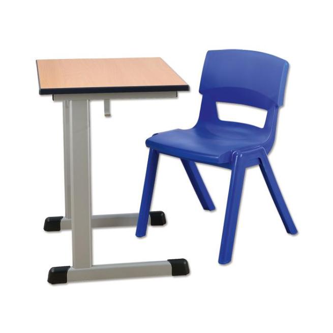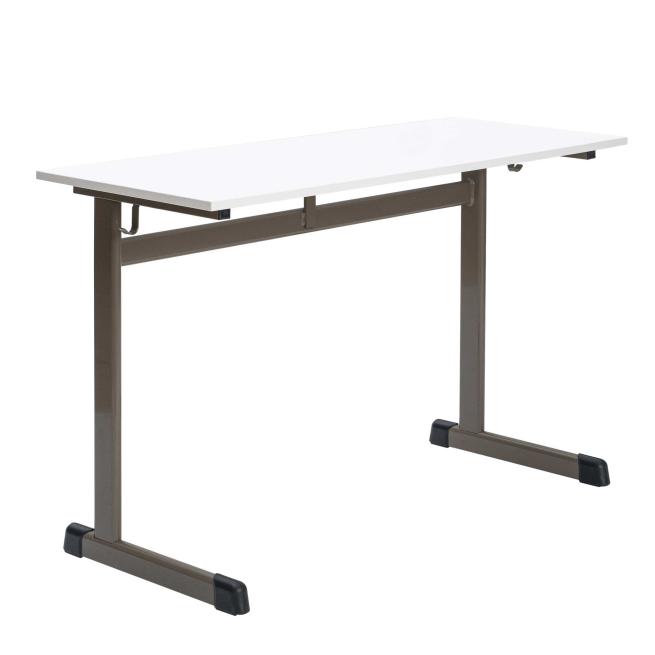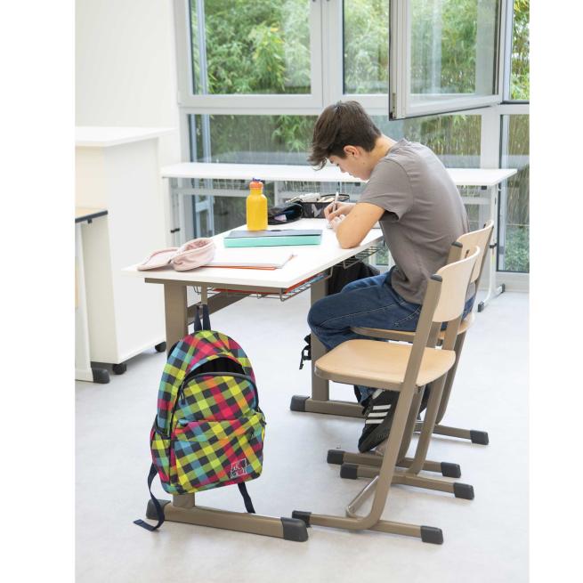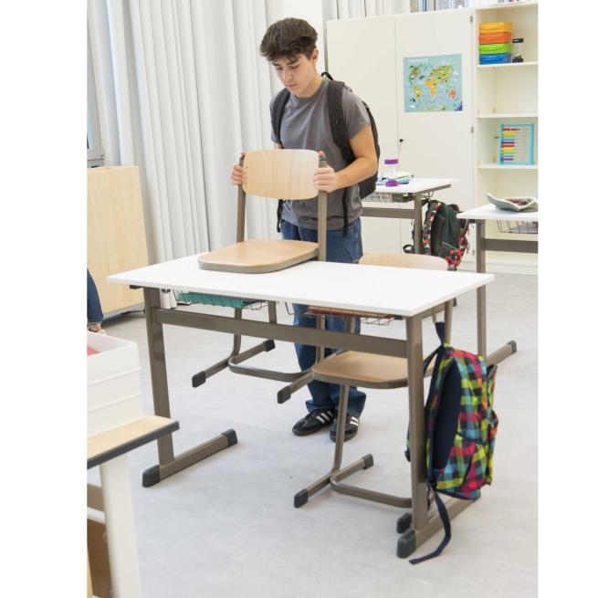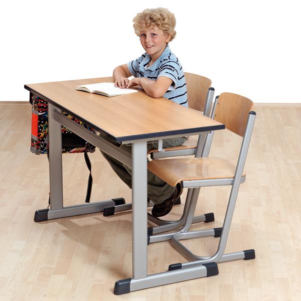Der praktisch unverwüstliche Schülertisch, Zweiplatztisch mit Vollkernplatte, PU- oder ABS-Kante. Gestell aus pulverbeschichtetem Ovalrohr. Alle Rohrenden sind mit recyclebaren, abgerundeten Kunststoffkappen oder Filzgleitern geschlossen. Das Gestell ist extrem robust. Die Profilstärke ist mit 7,5 cm stärker als bei dem C-Profil, daher kann man auf die Doppelung der Tischbeine verzichten.
