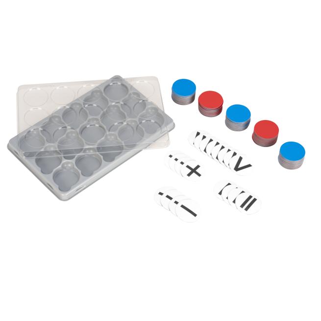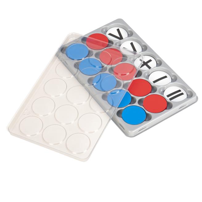Helfen insbesondere im Zahlenraum bis 20 beim Subtrahieren, Zerlegen, Ergänzen, Verdoppeln und Halbieren – die zweifarbigen, doppelseitig magnethaftenden Wendeplättchen. Sie erhalten 100 rot-blaue magnetische Wendeplättchen und 20 Magnetische Rechenzeichen, je Ø 5 cm im praktischen Sortierkasten.