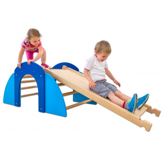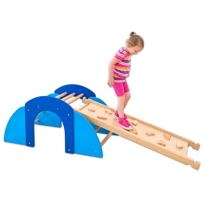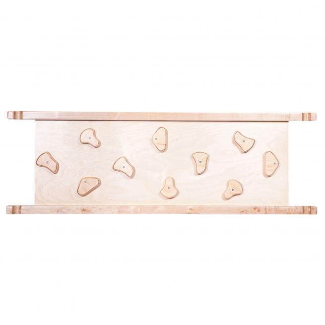 Das Brett hängen Sie in unterschiedlicher Neigung einfach an die Sprossen der Kletterbrücke (nicht enthalten, bitte separat bestellen). Die glatte Seite dient als Rutsche. Die andere Seite mit 10 abgerundeten Klettergriffen eignet sich perfekt als Kletterwand.
