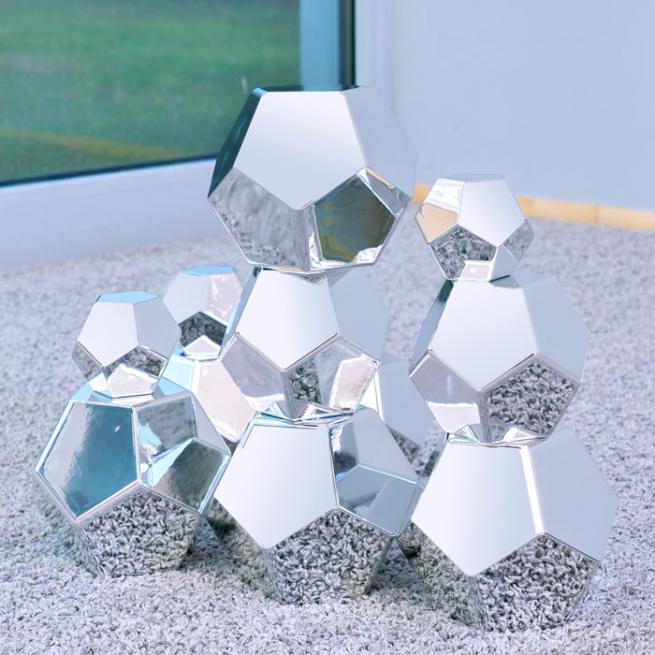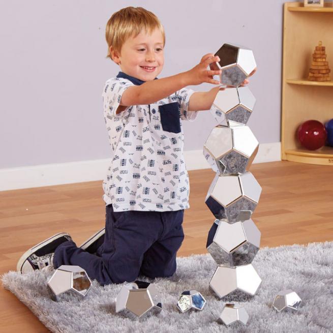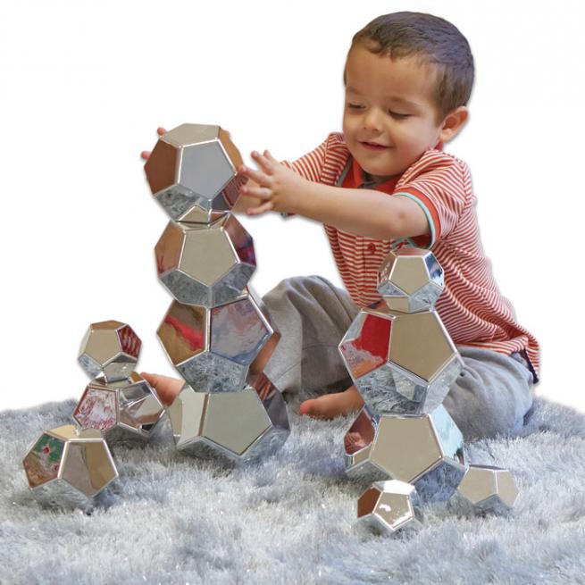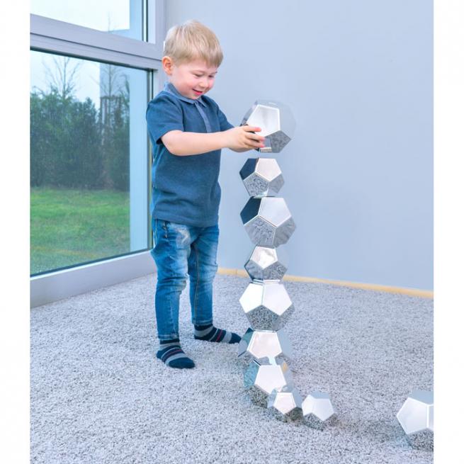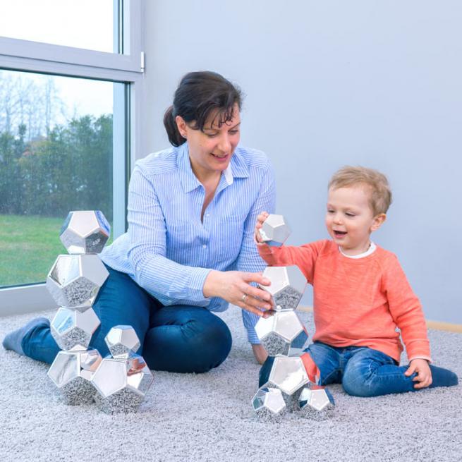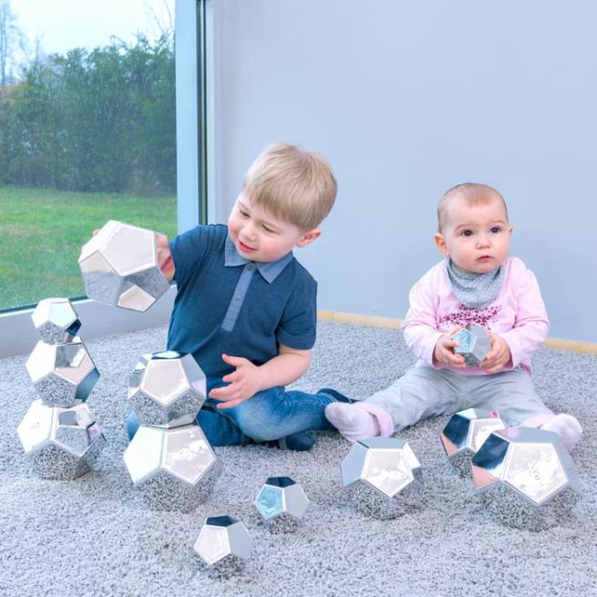 Die außergewöhnliche Form und die spiegelnde Oberfläche faszinieren Kinder. Aus den Bausteinen entstehen im Handumdrehen tolle Konstruktionen und Skulpturen.