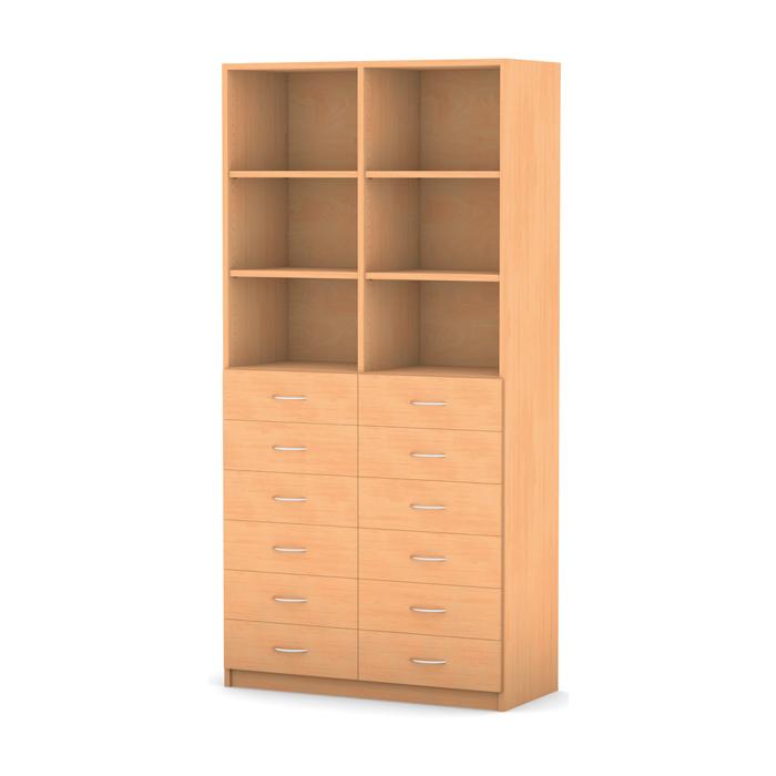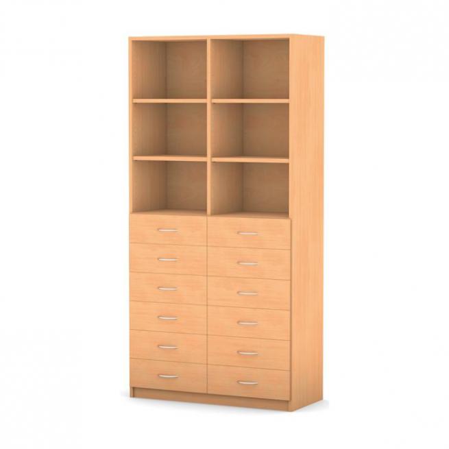 Regal mit Mittelwand, 12 flache Holzschubladen mit Griffen, mit 4 verstellbaren Böden