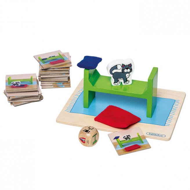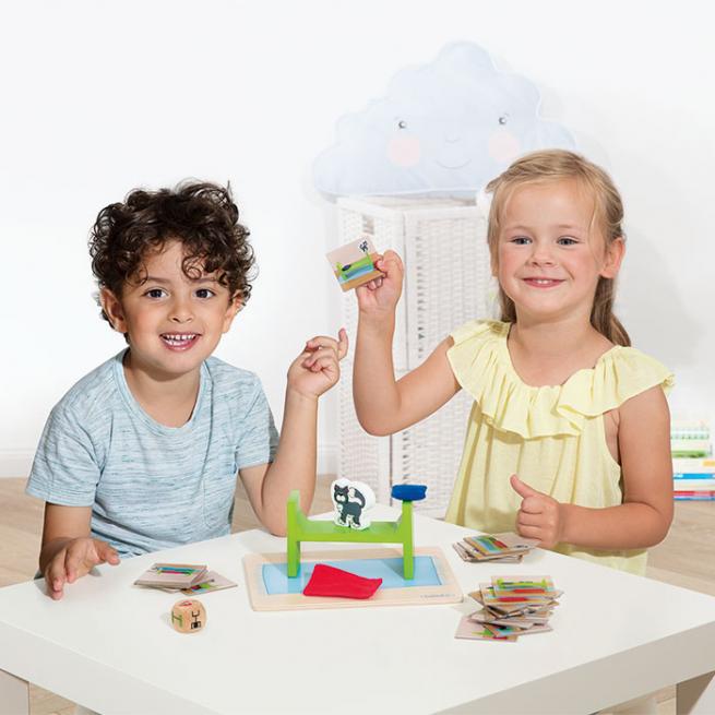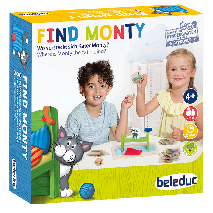 Sprachentwicklung und räumliches Denken fördern. Ein lustiger Spaß mit Kater Monty, der sich andauernd versteckt. Auf dem Spielbrett bauen die Kinder mit einem kleinen Bett, Kissen und Decke das Versteck des kleinen Streuners nach oder beschreiben es mithilfe der Fotokarten. Für 2 - 5 Spieler.