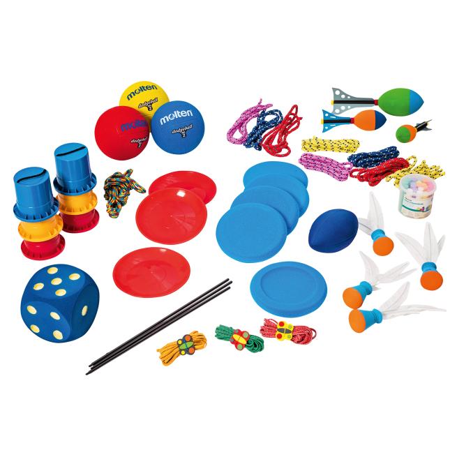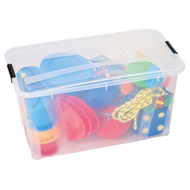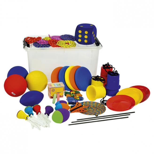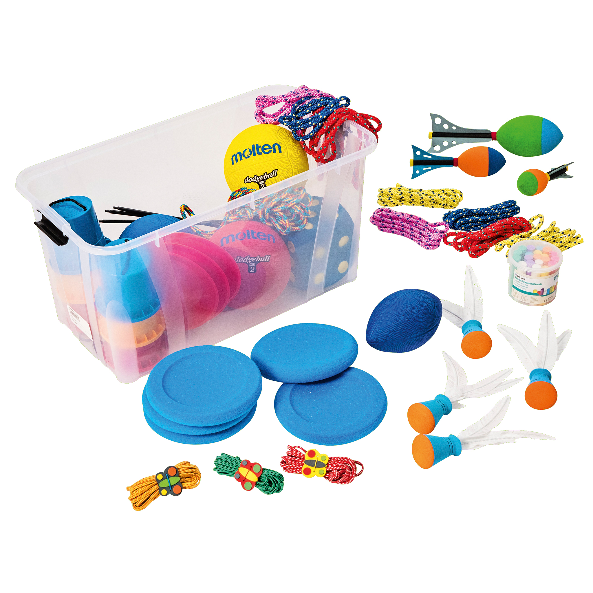 Ein Rundum-Spielpaket für den Pausenhof und die Turnhalle. Aufbewahrungsbox mit Deckel und 4 Rollen, die Ihnen die Handhabung der Box erleichtern.