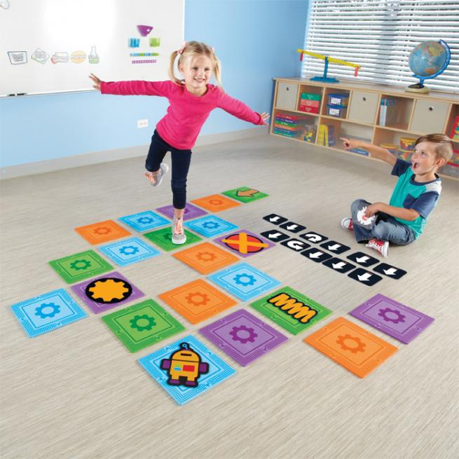 Programmieren fängt beim Planen von Bewegungsabläufen an – ganz ohne Rechner und Bildschirm. Gemeinsam bauen die Kinder einen Parcours auf, der sie zu einem lustigen kleinen Roboter führen soll. Mit den Programmierkarten stellen sie zudem jeden Schritt nach. Auf dem Weg zum lustigen Roboter müssen die Kinder allerdings mit besonderen Herausforderungen in Form von Federn, X-Zeichen und Zahnrädern zurechtkommen. Sind die Herausforderungen allein nicht lösbar, erkennen sie gemeinsam als Programmierteam Fehlschritte und stellen Wege um, damit sie den lustigen kleinen Roboter doch noch erreichen.