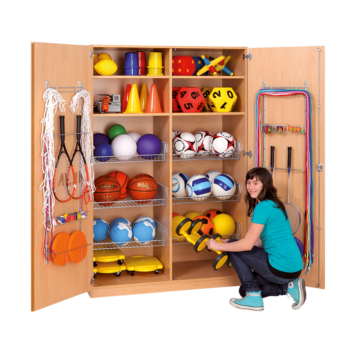Ihre Sportgeräte sind übersichtlich aufgeräumt. In den eingehängten Gitterkörben bleiben alle Bälle an ihrem Platz. Die Gitterkörbe sind höhenverstellbar. Praktische Gerätehaken an der Tür-Innenseiten nehmen noch mehr Sportgeräte auf.