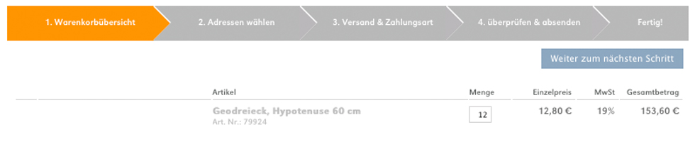 | 5. Warenkorb anzeigen: Ihren Warenkorb können Sie sich jederzeit anzeigen lassen. Klicken Sie dazu rechts oben auf den Warenkorb. Nun öffnen sich alle Artikel, die Sie in den Warenkorb gelegt haben. | 6. Warenkorb ändern: Möchten Sie die Stückzahl eines Artikels in Ihrem Warenkorb ändern, tragen Sie bei Menge Ihre gewünschte Anzahl ein und klicken danach unten auf die Schaltfläche Aktualisieren. Die Änderung ist jetzt übernommen. | 7. Artikel im Warenkorb löschen: Möchten Sie einen Artikel aus Ihrem Warenkorb ganz entfernen, dann klicken Sie bei dem betreffenden Artikel vorne das leere Kästchen an, sodass das Häkchen gesetzt ist. Nun klicken Sie unten auf die Schaltfläche Entfernen. Der Artikel ist nun aus Ihrem Warenkorb gelöscht. | 8. Bestellen – zur Kasse gehen: In Schritt 1. Warenkorbübersicht haben Sie die Möglichkeit, Artikel zu entfernen, den Warenkorb zu aktualisieren und ggf. einen Gutschein einzulösen. Dazu geben Sie den entsprechenden Code in das dafür vorgesehene Feld ein. Danach klicken Sie auf den Button Weiter zum nächsten Schritt. |