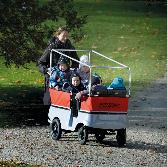 Die Handhabung des ergonomischen E-Turtle-KiGa-Busses ist sehr einfach. Er lässt sich leicht schieben und lenken und unterstützt Sie so merklich bei Steigungen bis zu 15 %. Sein Motor ist von außen nicht sichtbar. Direkt am Lenker befindet sich das übersichtliche Bedienfeld für den Antrieb. Dessen benutzerfreundliche Steuerung ermöglicht die stufenlose Geschwindigkeitsregulierung für müheloses Vor- und Rückwärtsfahren.